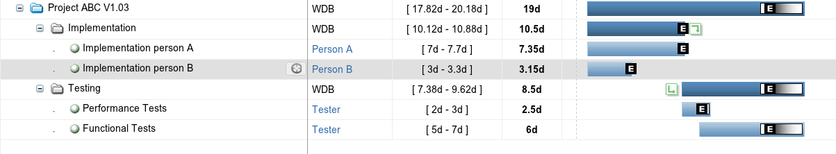 We have a project with 2 sub-projects: Implementation and Testing. Testing depends on Implementation obviously. We plan our testing time in LiquidPlanner and not in JIRA, so this is already done here. As you can see, there is no time allocated for implementation yet, but this is where our synchronizer kicks in.